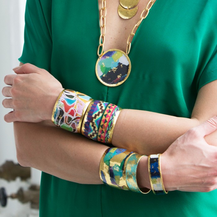 The sophisticated bold abstract image on this bracelet is designed to capture the vibrant energy of a modern united Berlin. Handmade in the USA, the rich golds and blues are artistically accentuated with a delicate eye-catching olive design. Wear this cuff with denim or silk and add a fresh chic, modern touch. This one is great for stacking.