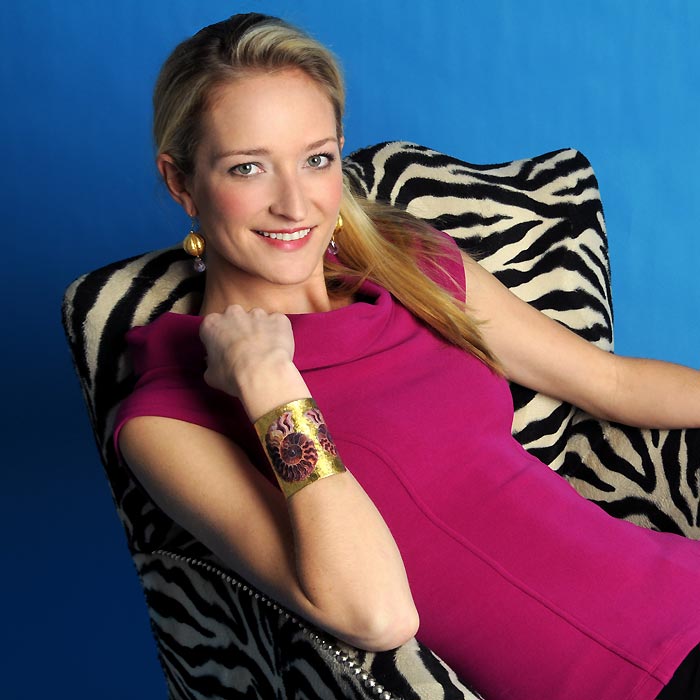 Take a deep sea dive into the past– and discover something new! The three shells that cross this popular, beautifully handcrafted cuff are images of ancient sea creatures from 400 million years ago. The spiral shell design uses shades of deep reds and pinks and stands out distinctly against a gold background. Wear this fashionable bracelet with a sun dress and take a romantic stroll along a sunny, warm shell filled beach.