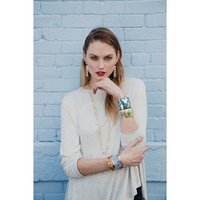 Our Lisbon cuff is inspired by the beautiful tradition and artistic use of tiles in Portugal, where hand painted tiles are used to decorate interiors and facades of houses and buildings. Like our jewelry, each one tells a story. Our jewelry is made by hand in our Connecticut studio, and features 22K gold leaf.