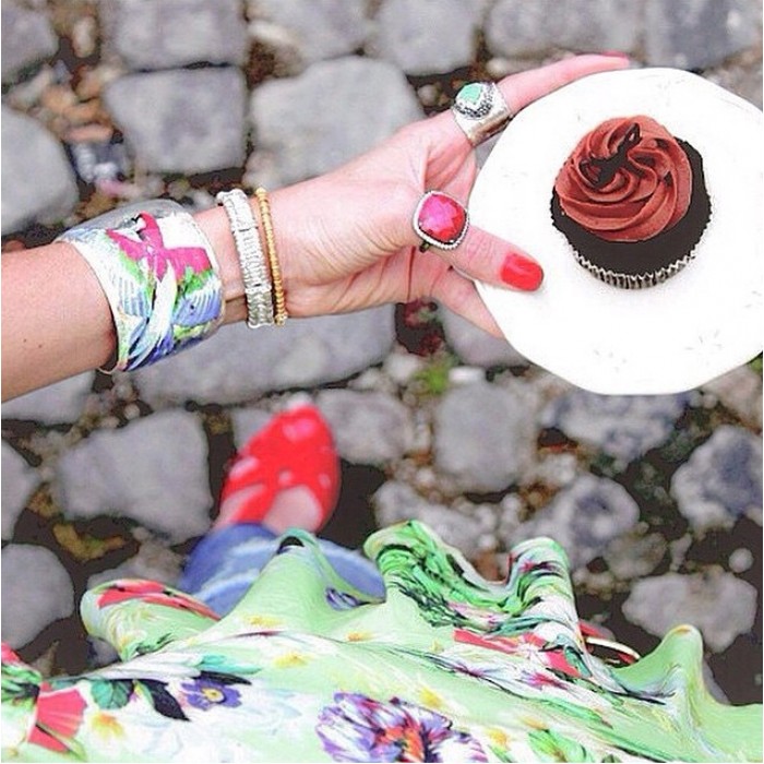 Take a flight of fancy when you don this exclusively designed bracelet adorned with the image of a large multi-colored parrot. Enjoy the detailed design and vibrant palette of red, blue and green depicting this beautiful bird with wings fully spanned. Handcrafted by skilled artisans in our USA studio, this cuff will add an eclectic shiny touch to minis, flowing skirts, tunics or tanks.