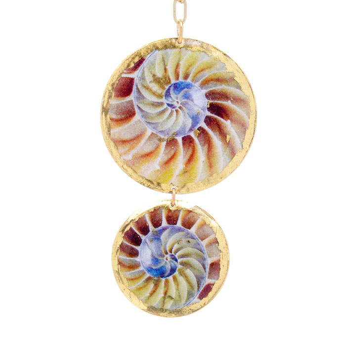 This fun beach themed two part pendant necklace is adorned with finely designed spiral-shaped nautilus shells in various shades of tan. Finished to a rich patina, the subtle accents of the blue sea draw the eye to the center. Handcrafted by skilled artisans in our USA studio, this pendant is the perfect accessory for a cotton polo shirt or casual T-shirt dress.