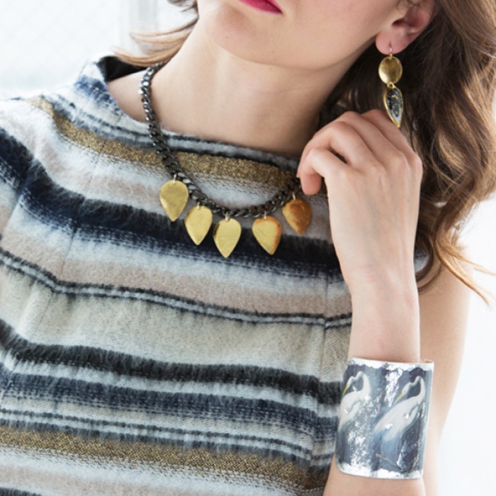 This distinctive cuff is adorned with three beautiful images of the elegant white plumed Great Egret. Seen in a preening pose, this bracelet captures the grace and soaring nature of this majestic bird. Finished in a rich silver patina, this cuff is modern and versatile and will bring dazzling shine to cottons, denims, jerseys and linens.
